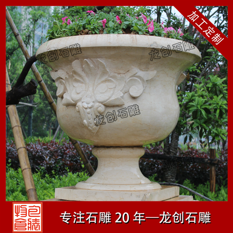 石雕花盆不僅外形美觀,造型新鮮多樣,還可以進行組合和裝飾。石雕花盆的格式多樣,并且在花盆的外邊雕刻著不同的圖案,裝飾性強,主要應用在園林綠化、景觀綠化、私家園林、小區綠化。石雕花盆不僅能夠用在公共場所,在家中也可以擺放一個小型的石雕花盆,搭配上不同顏色的花,更是美不勝收。