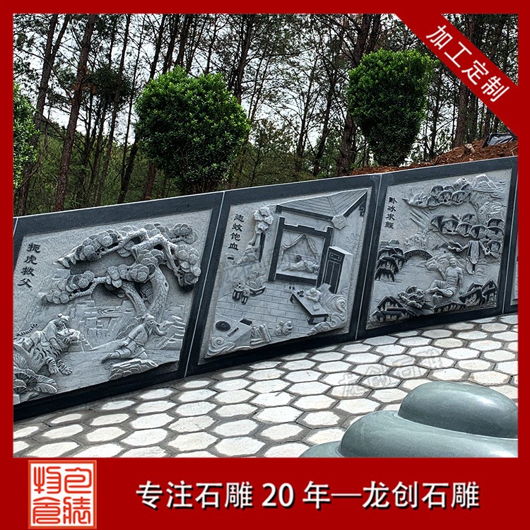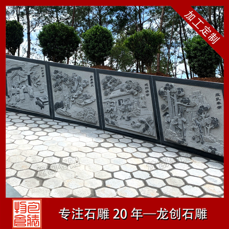 在墓園會使用到的石雕制品有很多,除了我們一開始會想到的石雕墓碑以外,還有些墓園會安裝石雕欄桿和石雕涼亭、石雕浮雕,墓園石雕欄桿除了起到安全防護(hù)作用外,還具有裝飾作用,而石雕涼亭的主要作用就是供人休息用的,石雕浮雕主要作用就是裝飾了,此套石雕墓圍的浮雕圖案是二十四孝。