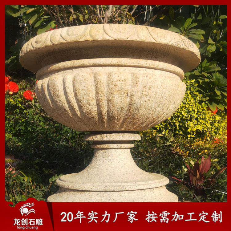 黃銹石石雕花盆花缽和黃金麻石雕花盆不但具有天然石材質地堅硬、耐磨、極具重量感的特征,更為難得的是花缽表面的質感以及強烈的可塑性和表現力,可使花缽盡顯各種不同的藝術風格。它可雕塑成各式特色花缽:歐式花缽、現代花缽、古典花缽、圓形花缽、長方形花缽、方形花缽、四方形花缽。還可在花缽上雕刻動物、人物形成動物花缽、人物花缽。