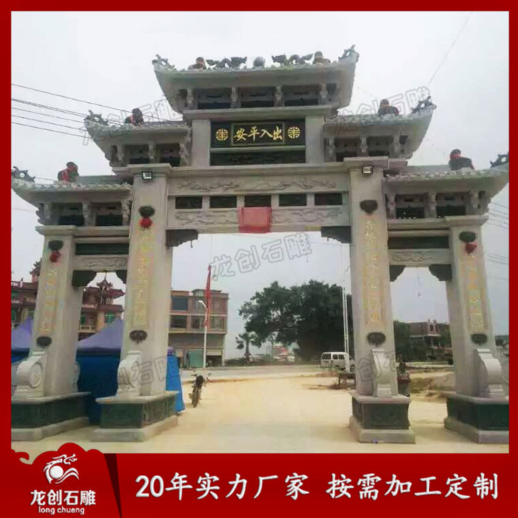 在生活中大型石雕牌坊制作安裝的場所挺多的,在新農村、風景區、寺院等地方都開始慢慢地建造大型石雕牌坊了。大型石雕牌坊在制作上采用了多樣化的雕刻工藝,雕刻制作出許多細致精湛的圖案,讓其與環境相互輝映,更具樸素質感貼近大自然。