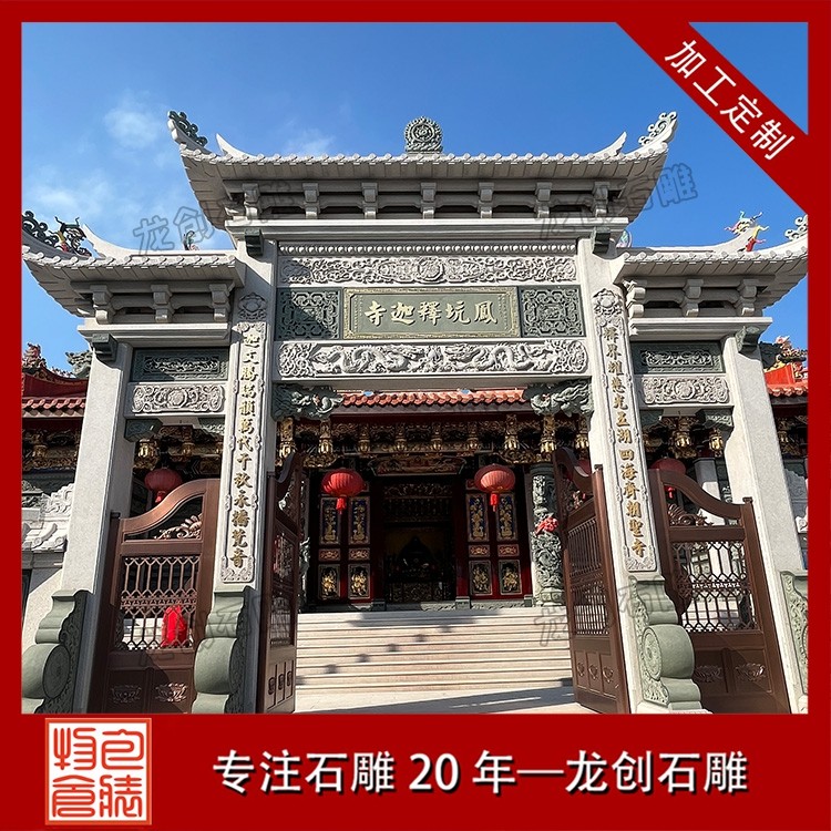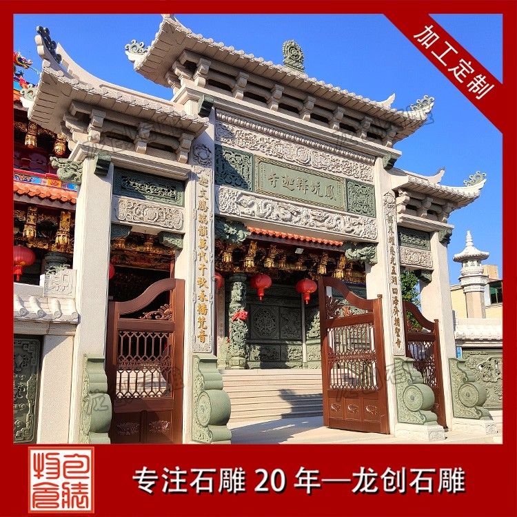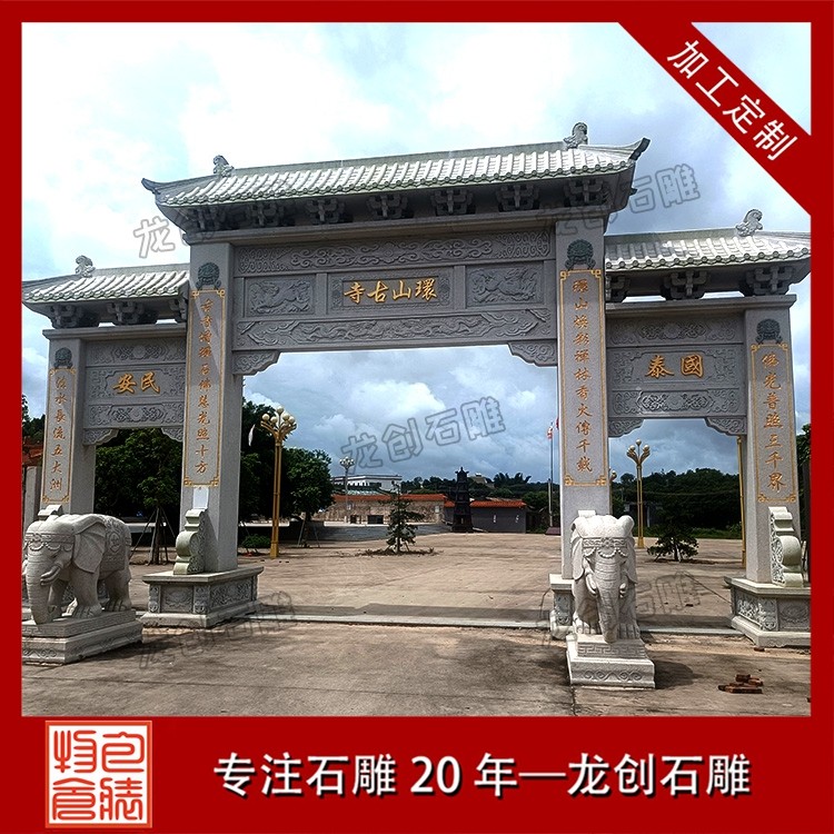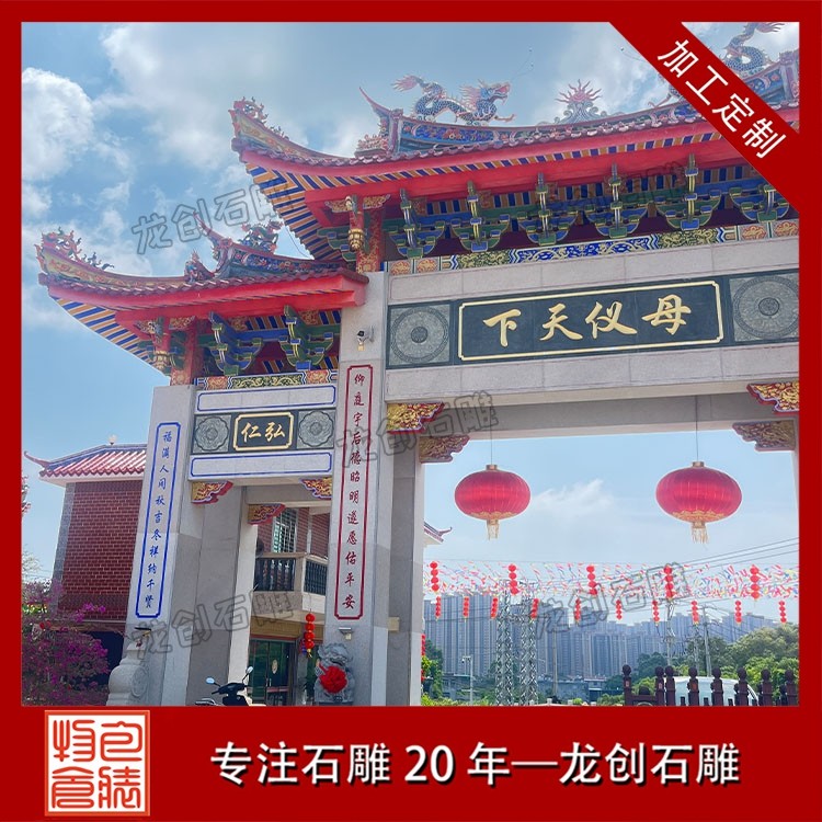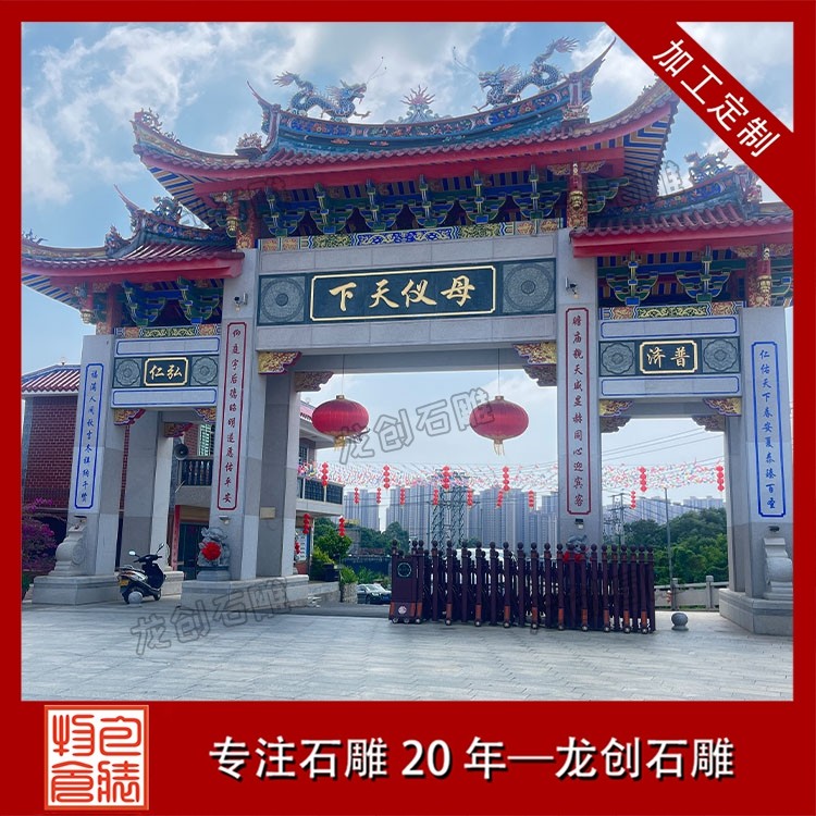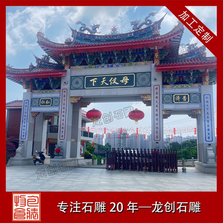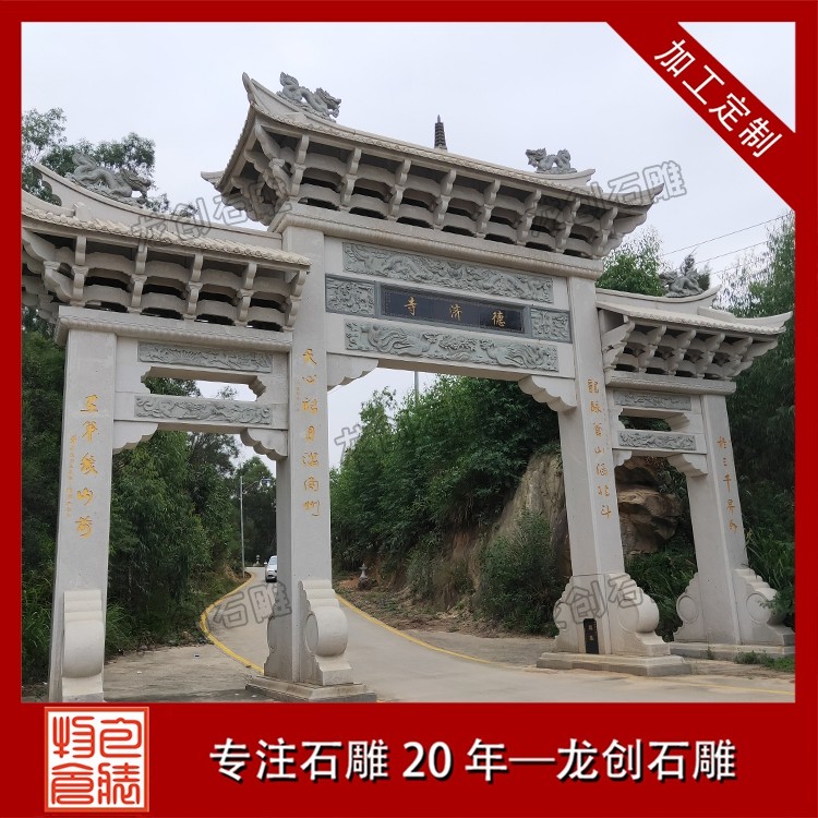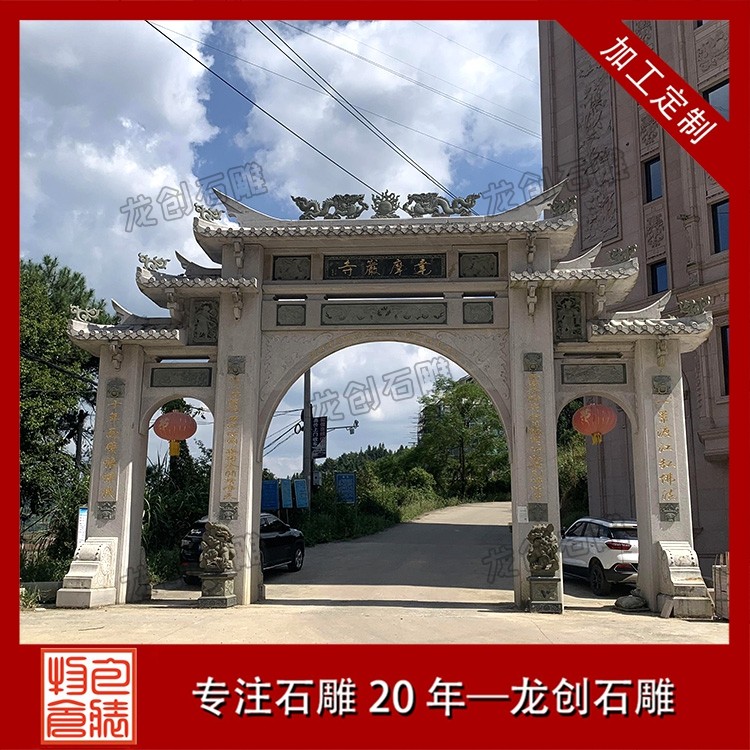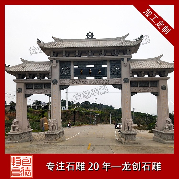 寺廟牌坊的風格通常更為莊重古樸,色彩素雅,營造出一種肅穆的氛圍。當信徒或游客穿過牌坊的那一刻,仿佛從喧囂的俗世踏入了一片清涼圣境,世俗的煩惱被拋在身后,內心自然而然地生出敬畏與虔誠 。牌坊上的雕刻也極具宗教特色,常見的圖案不是凡間的飛禽走獸,而是具有佛教寓意的蓮花(象征圣潔)、八寶(象征吉祥) 等。它既是寺廟的標志,也是引導眾生走向覺悟的精神前奏 。